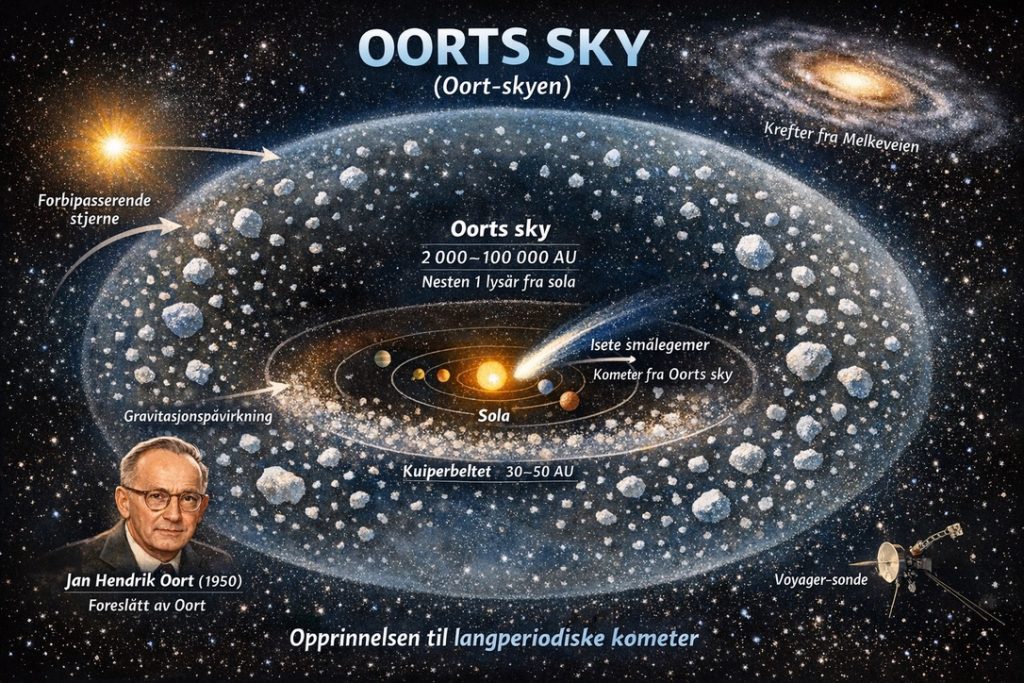Vidden av solsystemet vårt strekker seg langt utover de kjente planetene, og utfordrer intuisjonen vår om dets skala. Mens Neptun går i bane rundt 30 astronomiske enheter (AU) fra solen – en AU er jord-sol-avstanden – ligger den sanne ytre rekkefølgen i den hypotetiske Oorts Sky, et sfærisk skall av isete legemer som antas å markere gravitasjonsgrensen for solens påvirkning.